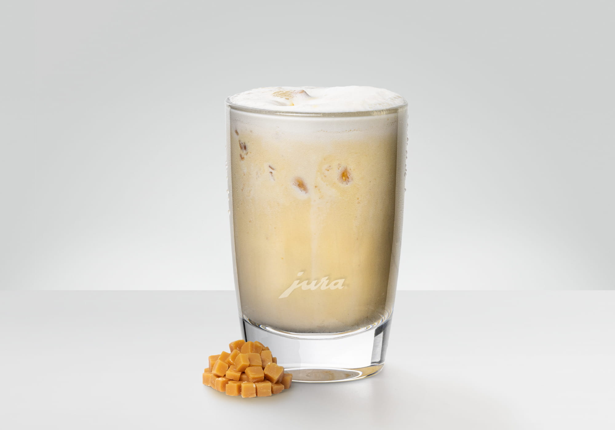 • Tag et lille latte macchiato-glas, og tilsæt to kugler mandelsaltet karamelis.